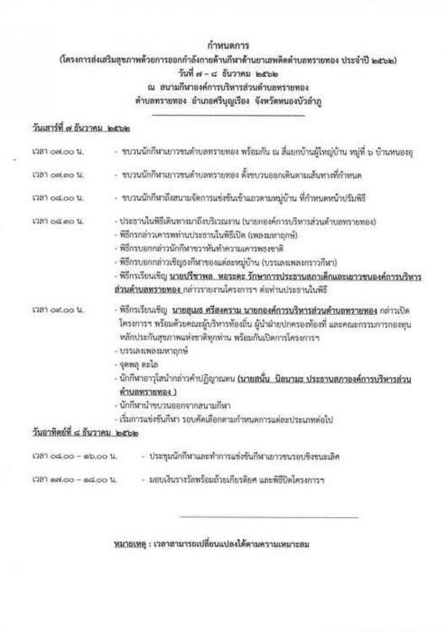 วันที่ 26 พฤศจิกายน 2562 นายสุเมธ ศรีสงคราม นายกองค์การบริหารส่วนตำบลทรายทอง เป็นประธานเปิดการประชุมการจัดแข่งขันกีฬาเยาวชนตำบลทรายทอง ประจำปีงบประมาณ 2562 โดยจัดขึ้นในระหว่างวันที่ 7-8 ธันวาคม 2562 ณ สนามกีฬาองค์การบริหารส่วนตำบลทรายทอง และมอบเงินสนับสนุนให้กับเยาวชนทั้ง 10 หมู่บ้าน ในตำบลทรายทอง รายการแข่งขันกีฬา มีดังนี้ 1. ฟุตบอลชาย 7 คน 2. วอลเล่ย์บอล หญิง 3. ตะกร้อ ชาย 4. ตะกร้อ หญิง 5. เปตองผสม (ชาย/หญิง) *** โดยจะมีพิธีเปิด ขบวนพาเหรดนักกีฬา เช้าวัน เสาร์ ที่ 7 ธันวาคม 2562 *** S:0