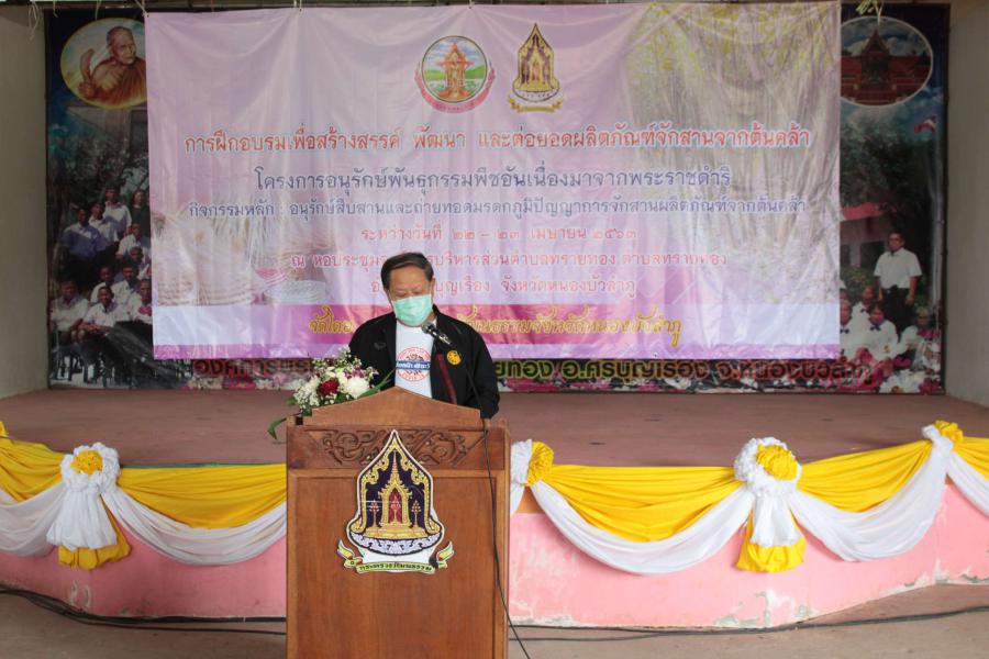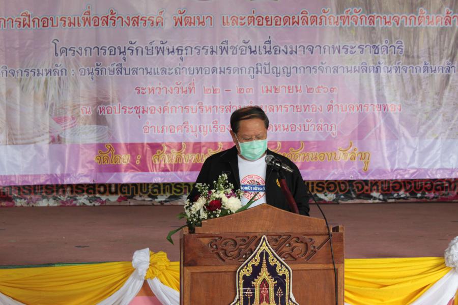 วันที่ 22 เมษายน 2563 นายสมเจตน์ จงศุภวิศาลกิจ ผู้ว่าราชการจังหวัดหนองบัวลำภู เป็นประธานในพิธี เปิดการฝึกอบรมเพื่อสร้างสรรค์ พัฒนา และต่อยอดผลิตภัณฑ์จักสานจากต้นคล้า โครงการอนุรักษ์พันธุกรรมพืชอันเนื่องมาจากพระราชดำริ กิจกรรมอนุรักษ์สืบสานและถ่ายทอดมรดกภูมิปัญญาการจักสานผลิตภัณฑ์จากต้นคล้า ระหว่างวันที่ 22 -23 เมษายน 2563 ณ หอประชุมองค์การบริหารส่วนตำบลทรายทอง จัดโดย สำนักงานวัฒนธรรมจังหวัดหนองบัวลำภู และลงพื้นที่ตำบลทรายทอง พร้อมด้วย นายสุภโชค พนาลิกุล นายอำเภอศรีบุญเรือง นายสุเมธ ศรีสงคราม นายกองค์การบริหารส่วนตำบลทรายทอง หัวหน้าส่วนราชการ สาธารณสุข ตำรวจ กำนันผู้ใหญ่บ้าน อสม. และเจ้าหน้าที่ ตรวจเยี่ยม ให้กำลังใจ ผู้ติดเชื้อโควิด-19 ที่รักษาหายแล้ว ผู้กักตัวเอง 14 วัน ที่เดินทางมาจากต่างจังหวัดและต่างประเทศ ให้ปฏิบัติตามคำสั่งของจังหวัด และคำแนะของกระทรวงสาธารณสุข S:0